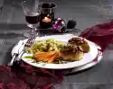Roast in the oven (electric cooker: 225 ° C/ convection oven: 200 ° C/ gas: level 4) for about 1 3/4 hours. After 15 minutes, pour 1/8 litre of hot water over it. Wash the oranges, grate dry, peel thinly, squeeze out the juice.