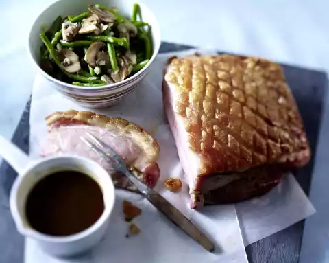 Preheat oven (electric cooker: 200°C/circulating air: 175°C/gas: level 3). Wash the meat, dab dry, cut the rind with a sharp knife (also good: clean cutter knife) in a diamond shape.