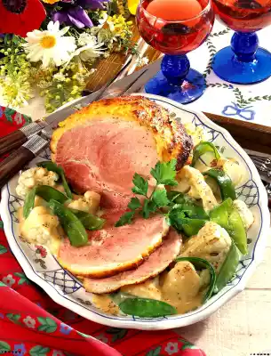Simmer for about 8 minutes. Steam sugar snap peas in boiling salted water for approx. 5 minutes. Refine sauce with crème fraîche. Season to taste with salt, pepper and the rest of the horseradish. Heat the cauliflower in the sauce. Cut the roast open. Serve with vegetables and sauce. Garnish with parsley