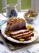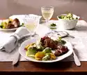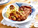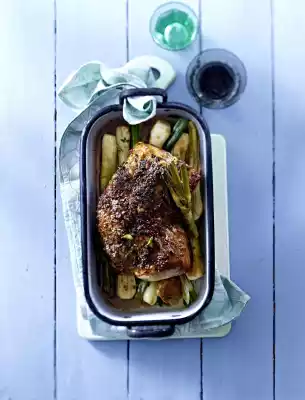 Place the roast and halved garlic bulb in a roasting pan and bake in a preheated oven (electric cooker: 200 °C/ convection oven: 175 °C/ gas: level 3) for 1 1/2-2 hours. Pour on white wine after approx. 45 minutes