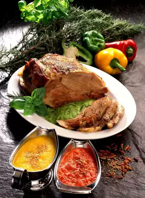 Heat all sauces again. Season to taste with salt and pepper. Cut the roast open and garnish as desired with a bouquet of herbs. Serve the sauces warm. Roast potatoes taste good with it.