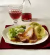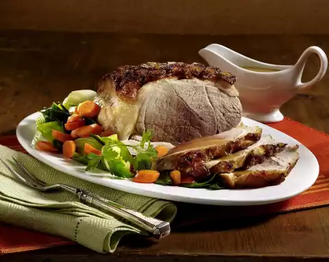 Peel the onions, cut them into slices and distribute around the roast. Remove the finished roast from the tray and wrap in aluminium foil. Loosen the roast with stock. Pour through a sieve and bring to the boil. Stir starch and a little water until smooth, thicken sauce with it.