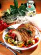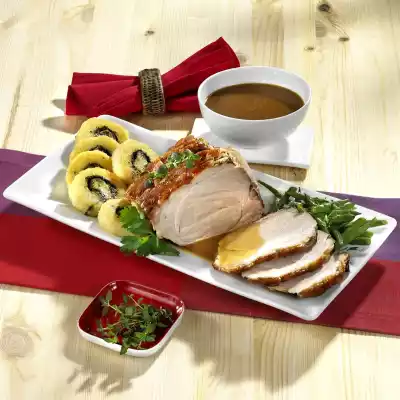 Wash the meat, dab dry and make a diamond-shaped incision in the rind. Season meat with salt and pepper and put it together with 100 ml water in a roaster. Peel onions and carrots, cut roughly into pieces and add to the meat. Roast without lid in a preheated oven (electric cooker: 200 °C/ convection oven: 175 °C/ gas: level 3) for approx. 2 hours. After about 30 minutes, add bay leaf and cloves and gradually pour on the stock. In the meantime, stir the potato dumpling powder into 3/4 litre cold water and let it swell for about 10 minutes. Wash the herbs, dab dry and chop, except for something to garnish.