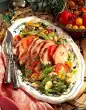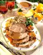 Let it simmer at low heat for 25-30 minutes. Lift out of the water with the aluminium foil, drain well and allow to cool slightly. In the meantime, brush the roast pork with cold salted water about 10 minutes before the end of the roasting time. Put beans into 250 ml boiling salted water, bring to the boil, cover and cook for about 7 minutes. Keep the finished roast warm. Pour stock through a sieve into a pot. Add cream, bring to the boil and pour in the sauce thickener while stirring. Bring to the boil again, season with salt and pepper. Drain the beans, add 20 g fat and the remaining parsley and toss with the beans. Cut potato rolls into 9 thick slices each. Heat 30 g fat in a large pan and fry the potato thalers lightly while turning. Arrange the crusted roast with potato thalers and beans on a large plate. Pour some sauce over the meat and serve garnished with parsley and thyme. Add the rest of the sauce extra