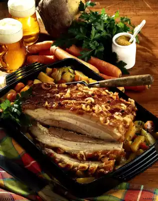 Wash the meat, dab dry and cut the rind with a sharp knife in a diamond shape. Season meat with salt and pepper. Stick cloves into the rind. Place the meat in a large roasting pan. Roast in the preheated oven (electric cooker: 175 °C/ gas: level 2) for 2 1/2 hours. In the meantime, peel potatoes and cut them into large pieces. Clean and wash the vegetables.