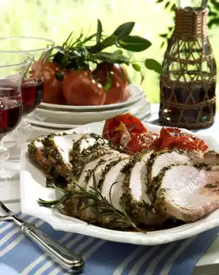 Spread the herb mixture over the meat approx. 30 minutes before the end of the frying time. Place the tomatoes in the fat pan. Remove the roast and let it rest for 5-10 minutes. Remove meat from the bone and cut into thin slices.
