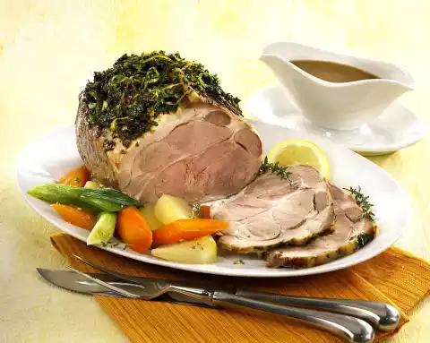 Wash the herbs, dab dry and chop finely. Peel garlic and chop finely. Wash lemon hot, rub dry and peel with a zest ripper. Mix oil, lemon peel and herbs. Wash the meat, dab dry and season with salt and pepper. Place the meat on a fat pan of the oven and spread half of the herb mixture (Gremolata) on top and press lightly. Roast the meat in a preheated oven (electric cooker: 175 °C/ convection oven: 150 °C/ gas: level 2) for approx. 1 3/4 hours.