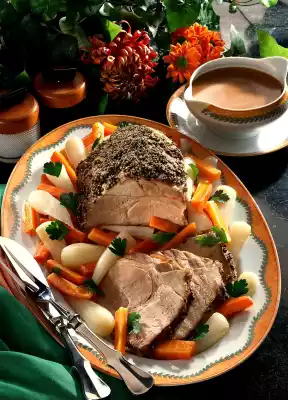 Wash the meat, dab dry and rub with salt and pepper. Peel and halve onions and 1 carrot. Wash the tomato. Put onions, tomato, carrot and meat on the fat pan of the oven and roast in the preheated oven (electric: 200°C/ gas: level 3) for 1 1/2 -2 hours. Gradually add 3/8 litres of water. In the meantime, wash parsley and dab dry. Put something aside for garnishing. Finely chop the rest. Put mustard seeds in a pan without fat and roast them until golden brown while stirring. Mix honey, mustard seeds, sambal oelek, salt and parsley. Coat the meat with the paste 30 minutes before the end of the roasting time. Peel and wash the remaining carrots and turnips and cut them into coarse sticks or cut them in half lengthwise. Steam vegetables in little boiling salted water for 15-20 minutes. Remove the roast from the oven and keep it warm for a short time. Dissolve the roast with wine and 1/8 litre of water and put the vegetables through a sieve into a small pot. Bring to the boil, add cream and thicken with the sauce thickener. Bring to the boil again briefly. Season to taste with salt and pepper. Drain the vegetables, toss in fat and arrange on a plate with the roast. Garnish with remaining parsley. Add sauce extra