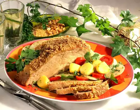 In the meantime, finely chop the peanuts for the crust. Peel garlic and press it through a garlic press. Mix with breadcrumbs. Spread the crust on the roast after 1 hour frying time. Add 1 tablespoon of fat in flakes and cook the roast for another 15 minutes.