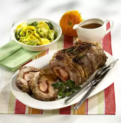 Pour the roast stock through a sieve into a pot and bring to the boil. Stir in sauce thickener and bring to the boil. Season to taste with salt and pepper. Arrange meat, cabbage noodles and sauce garnished with parsley.