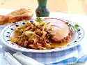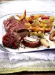 Peel, wash and cut the carrots into pieces. Peel and chop 2 onions. Heat clarified butter in a roasting pan. Fry the rolled roast thoroughly all around, remove. Sauté the onions and carrots in the frying fat. Add wine and stock, bring to the boil. Put the roast back into the roaster and put the lid on. Braise in the preheated oven (electric cooker: 200 °C/ convection oven: 175 °C/ gas: level 3) for 1 3/4-2 hours. Remove the lid about 30 minutes before the end of the cooking time