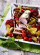 Wash the meat, dab dry and sprinkle with salt and pepper. Wash the herbs. Remove the needles from the branches and leaves from the stems and chop them into small pieces. Mix cream cheese with herbs, season with pepper. Brush meat with it. Wash the grapes, pluck them from the stalks and cut them in half. Spread on the cheese, press on and cover with ham slices. Roll the meat up tightly and tie it with kitchen string to a rolled roast