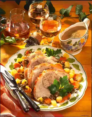 Place the meat, halved onions, leek and peppercorns on a fat pan and bake in a preheated oven (electric range: 175 °C / gas: level 2) for approx. 2 hours. After half of the frying time, deglaze the roast with 1/2 litre stock.
