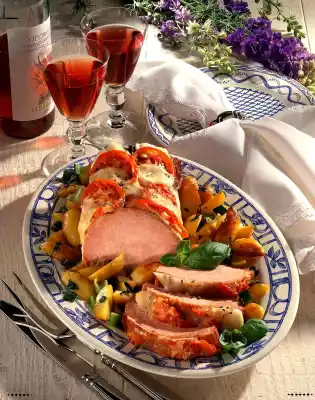 Sprinkle with coloured pepper and gratinate. Cut basil leaves into strips and add to the potatoes. Arrange sliced pork and potatoes on a plate.