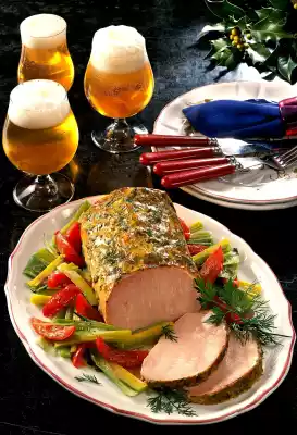 Cut leek rolls into quarters lengthwise. Wash the tomatoes, remove the seeds by halving. Cut into slices. Heat the fat in a pan and braise the vegetables for 2 - 3 minutes. Season with salt and pepper. Spread the mustard mixture on the Kassler about 10 minutes before the end of the cooking time and fry until done. Lift the Kassler out of the fat pan and let it rest in the switched off oven. Pour the frying stock through a sieve and dissolve the frying mixture with a little water. Add cream and bring the stock to the boil. Stir in the sauce thickener and bring to the boil again briefly. Season to taste with salt and pepper. Put the vegetables on a plate and arrange the Kasslerbraten on top. Garnish with fresh herbs