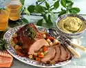 Season the roast all around with salt and pepper. Place on a grill over the fat pan. Roast in the preheated oven (electric cooker: 175 °C/ convection oven: 150 °C/ gas: level 2) for approx. 1 3/4 hours. In the meantime, clean and wash the soup greens and peel if necessary. Peel the vegetable onion as well. Cut the vegetables into large pieces and spread them on the fat pan.