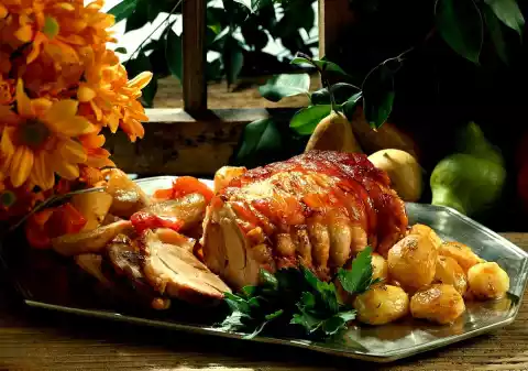 Turn the potatoes once. Let the roast rest for ten minutes before cutting. Arrange everything on a plate and garnish with parsley.