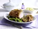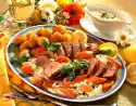 Cook the potatoes in salted water for about 20 minutes. Remove roast, keep warm. Pour the stock through a sieve into a pot (degrease if necessary), brush the onions with it. Or mash onions in the sauce. Refine sauce with cream and season to taste. Drain the potatoes. Serve with roast, pineapple herb and rings. Serve with extra sauce. Garnish with parsley if desired.