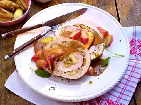 Finish roast from the roaster lift. Pour the stock through a sieve into a pot, bring to the boil. Mix the starch with a little water, thicken the stock slightly and bring to the boil again. Stir in crème fraiche. Cut the roast open, remove the thread. Arrange roast, sauce and rhubarb vegetables, garnish with sage. Fried potato wedges taste good with it