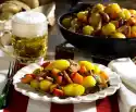 Wash the potatoes thoroughly and cut them in half lengthwise. Fry them in 2 tablespoons of hot oil for 20-25 minutes. Cut garlic into cloves (do not peel). Wash and pluck the thyme. Fry garlic, pieces of spring onion and thyme for about 15 minutes. Season with salt and chili