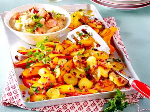 Wash the potatoes and cook in boiling water for about 20 minutes. Drain, quench, peel and slice the potatoes. Pumpkin wash, quarter, core and cut into slices. Mix 2-3 tbsp. oil, 1 tsp. salt and honey well.