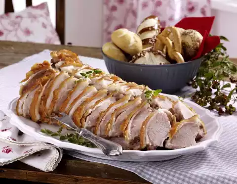 Stir apple jelly. Brush the meat with the jelly 5 minutes before the end of cooking. Remove the roast from the oven, wrap in aluminium foil and leave to rest for a while. Cut the roast into slices and arrange on a plate. Garnish with marjoram
