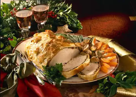 Fold the chopped herbs under the mushroom farce. Place the mushroom sauce on the leaves, leaving a small rim free. Place the turkey roast with the upper side on the mushrooms and wrap in puff pastry. Roll out remaining puff pastry and cut out stars.