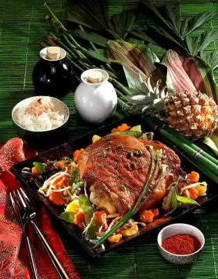 Add sugar snap peas, mushrooms, pineapple and sprouts and cook briefly. Remove the roast from the roaster. Add frying stock to the ketchup sauce, pour over the vegetables and bring to the boil again. Arrange the roast with the vegetables on a plate.