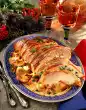 Spread the cream cheese mixture on the inner side, leaving an approx. 2 cm wide edge. Roll up the turkey and stick together with wooden skewers. Cover roast with bacon, sage and a little rosemary.