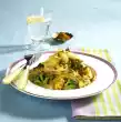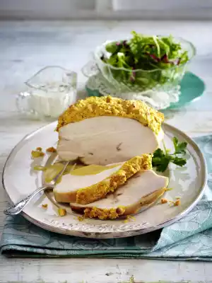 Spread carrot crust on the meat. Place the meat on a rack and bake in a preheated oven (electric range: 225 °C/ convection oven: 200 °C/ gas: level 4) for approx. 20 minutes. Pour gravy through a sieve into a pot. Wash parsley, dab dry and chop except for a little bit for garnishing. Finely puree yoghurt, milk and parsley with a hand blender. Season to taste with salt, pepper and sugar. Wash and drain the salad. Bring gravy to the boil, season to taste with salt, pepper and curry. Mix starch with 2 tablespoons of water. Thicken sauce with it. Arrange meat on a plate. Add curry sauce, salad and yoghurt dressing