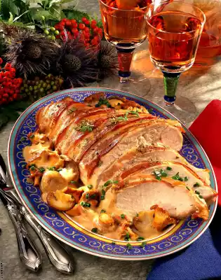 Keep the roast warm. Sieve the stock and add to the mushrooms. Add sauce powder and simmer for about 1 minute. Serve everything. Serve with hash browns or spaetzle