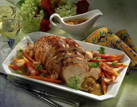 Wash the roast and pat dry. Season all around with salt and pepper. Put them on the lightly oil-coated fat pan of the oven. Cook in the preheated oven (electric cooker: 200 °C/ circulating air: 175 °C/ gas: level 3) for approx. 1 hour. Clean, wash and cut soup vegetables into pieces. 1/2 hour before the end of the cooking time, place them on the fat pan. Deglaze with vegetable stock 10 minutes before the end of the cooking time.