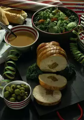 Finally, knead in the olive slices. Spread the inside of the turkey breast with the minced meat filling and roll up firmly. Tie together with kitchen string. Rub the outside of the roast with salt and pepper.
