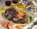 Pour a little marinade over it several times. Clean and wash the vegetables. Cut cabbage into slices, carrots diagonally. Cook vegetables in boiling salted water for about 10 minutes. Mix cream and flour and pour it over the roast 10 minutes before the end of the cooking time.