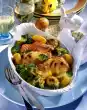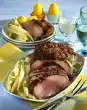Cover with the bacon slices and spread 20 g of fat in flakes on top. Grease a roasting pan and place the roast inside. Roast in the preheated oven (electric cooker: 200 °C/ gas: level 3) for about 1 1/2 hours.