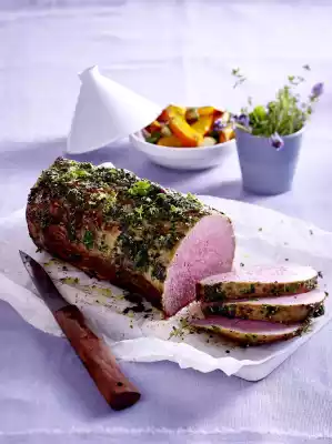 Place the roast on parchment paper and coat with the spiced butter. Seal the paper and cook in the preheated oven (electric cooker: 175 °C/ circulating air: 150 °C/ gas: see manufacturer) for approx. 1 1/4 hours (approx. 58°C core temperature).