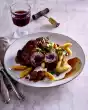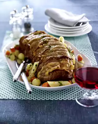 Wrap the roast with green bacon, tie it with kitchen twine and place it in an ovenproof dish. Peel garlic, cut in half and add to the roast. Sprinkle with 2 tablespoons of olive oil and bake in a preheated oven (electric cooker: 200 °C/ convection oven: 175 °C/ gas: see manufacturer) for approx. 25 minutes