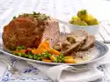 Remove meat from the oven and let it rest for 10 minutes. Wash parsley, shake dry and chop the leaves into small pieces. Remove kitchen string from the roast. Arrange roast and vegetables on a plate, drizzle with 3 tablespoons of olive oil. Sprinkle with chopped parsley and serve immediately