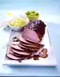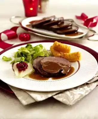 Keep the roast warm. Sieve the stock and boil down for 5-10 minutes. Stir starch and 3-4 tbsp. water until smooth. Stir into the stock and bring to the boil. Season to taste with salt and pepper. Cut the meat open and serve with the sauce.