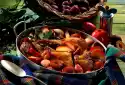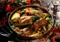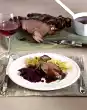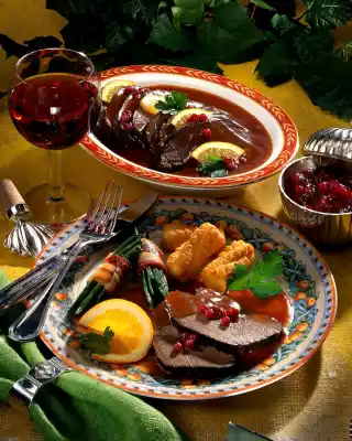 Defrost frozen meat. Clean and wash the greens. Peel onions. Coarsely chop both and boil with 100 ml water, wine, juniper and peppercorns. Leave to cool. Wash the meat and marinate for approx. 24 hours