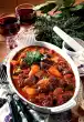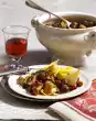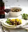 Dab meat dry, season. Sieve the marinade and save the vegetables. Fry meat all around in 2 tablespoons of hot oil. Fry the vegetables briefly. Deglaze with marinade and stock bit by bit, bring to the boil. Cover and braise for 1-11/4 hours