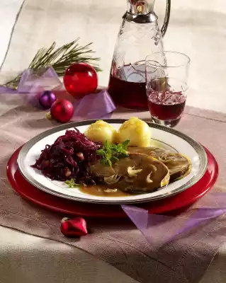 Season the red cabbage once more. Remove the dumplings with a skimmer and let them drip off. Cut the roast open. Arrange roast with dumplings, sauce and red cabbage. Pour crumb butter over the dumplings.