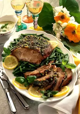 Cook in boiling salted water for about 17 minutes. Shortly before serving, toss drained beans in hot fat. For the sauce, pour the roast stock through a sieve. Wash the remaining herbs and chop them coarsely, except for a little to garnish. Grate cheese. Puree the herbs in the stock. Add cream and cheese, bring to the boil. Add sauce thickener, bring to the boil again. Season to taste with salt, pepper and remaining mustard. Sprinkle roast and vegetables with coloured pepper and arrange on a preheated plate. Serve garnished with lemon slices and remaining herbs. Serve with extra sauce