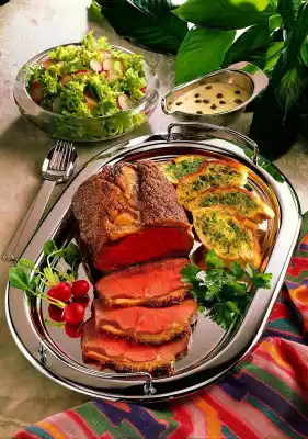 Season to taste with salt and pepper. Remove the roast beef and let it rest for a while. Bake bread in the hot oven until golden brown. Cut the roast beef and arrange it on a plate with the bread. Garnish with parsley and radishes.