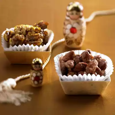 Bring just under 1/8 litre water, 200 g sugar and 1 packet of vanillin sugar to the boil in a coated pan. Add the almonds and cook at high temperature, stirring constantly, until the sugar is dry. Turn down to medium temperature and stir until the sugar melts again. Put the almonds on baking paper and pull them apart immediately with 2 forks. Caramelise walnuts in the same way