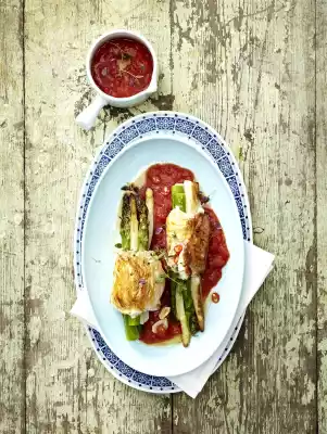 Remove the asparagus parcels, arrange on plates with sauce and garnish with thyme.