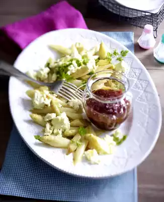 Wash the chervil, shake dry and pluck the leaves. Crumble the feta coarsely and add to the asparagus. Fry together for about 5 minutes. Fold in chervil and serve with rhubarb chutney.