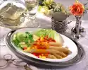 Season with salt and pepper. Wash and peel the asparagus and cut off the woody ends generously. Cut the asparagus diagonally into pieces. Heat 2 tablespoons of oil and butter in a large frying pan. Stir-fry the asparagus for about 10 minutes at medium heat.