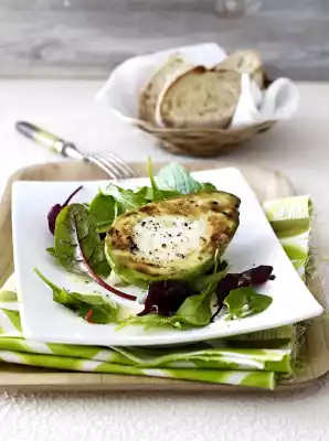 Squeeze the lemon. Mash goat cheese with a fork. Season with pepper. Peel and halve avocados and remove the stone. Brush the avocado all around with lemon juice. Season inside with salt and pepper.