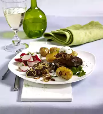 Wash potatoes thoroughly and cook in boiling water for 10-15 minutes. Clean, wash and quarter the radishes. Wash herbs and pat dry. Put some parsley aside for garnishing, chop the rest finely.